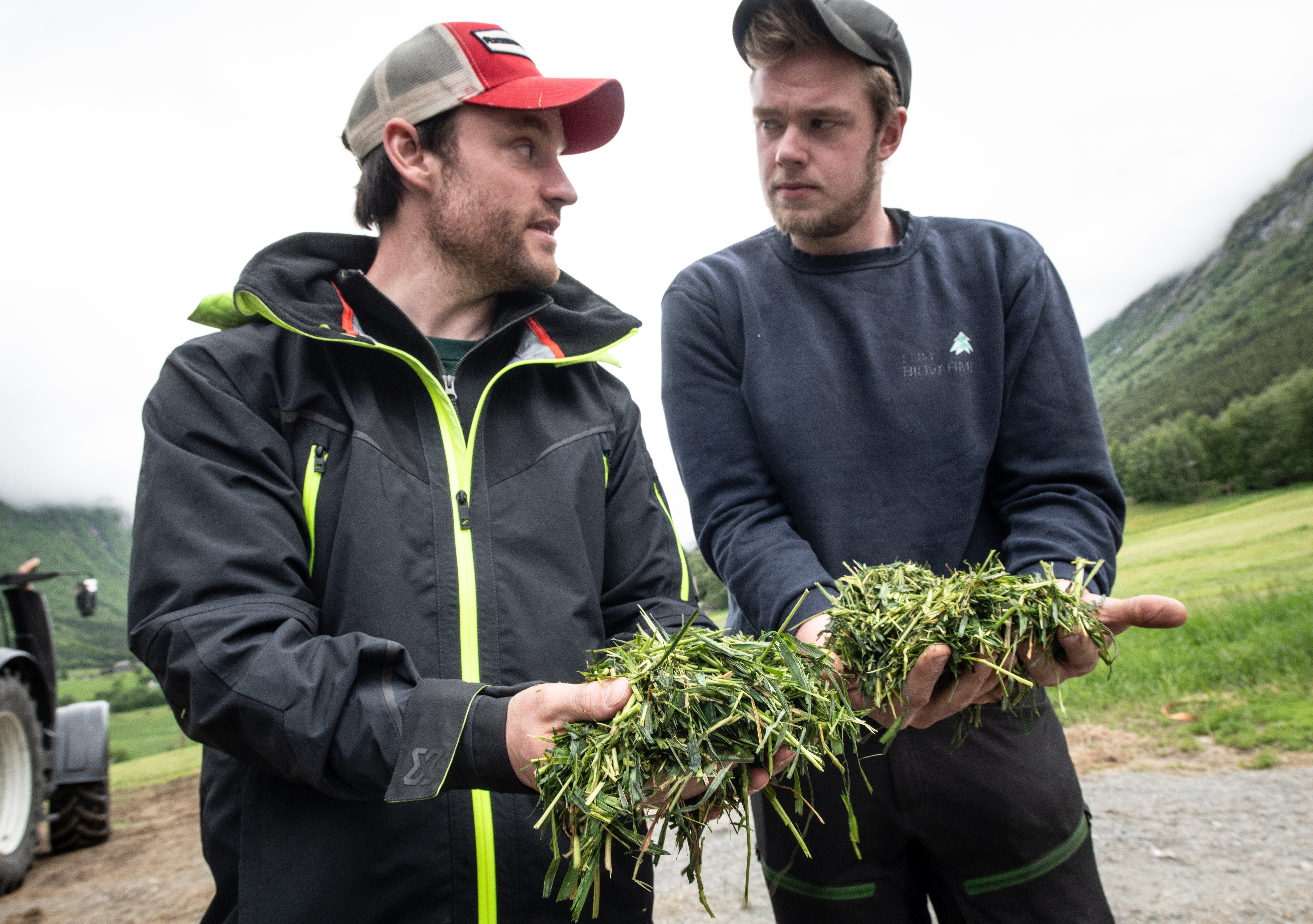 – Se det fôret! Den kvaliteten!, konstaterer Espen Kvålshagen og Erik Vaagaasar der de står med hendene fulle av graset som nettopp er snittet og kjørt til siloen hos Kolden.