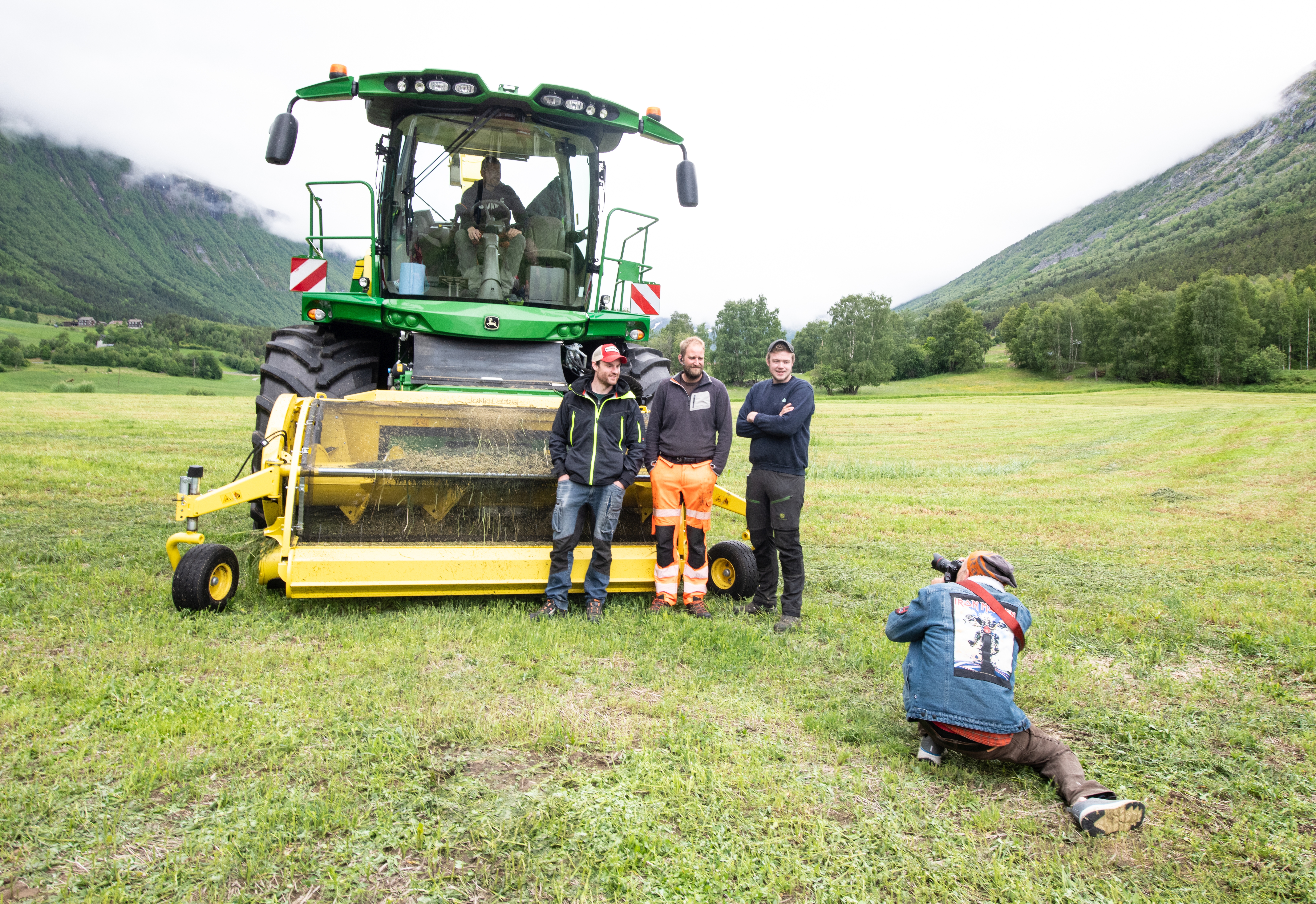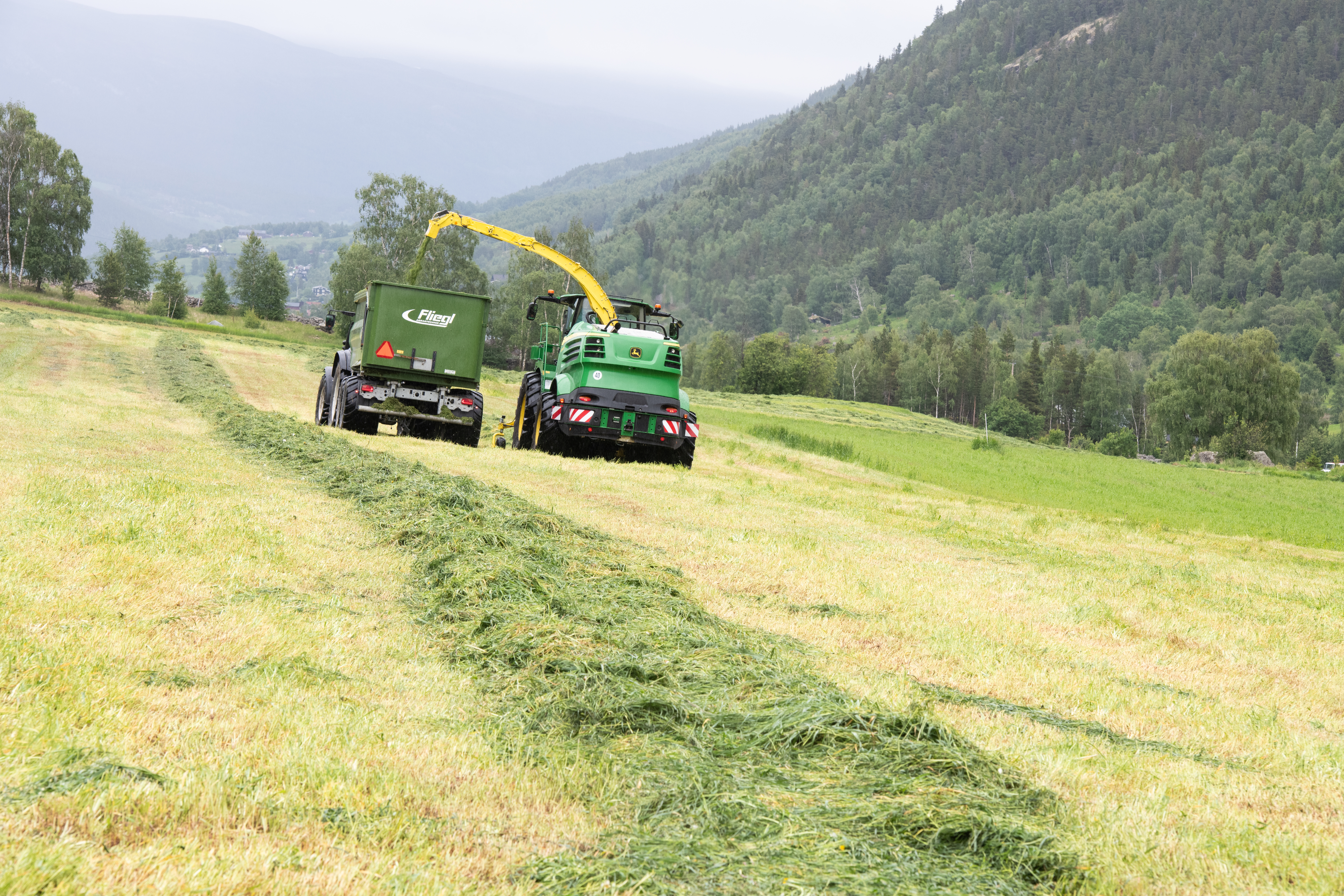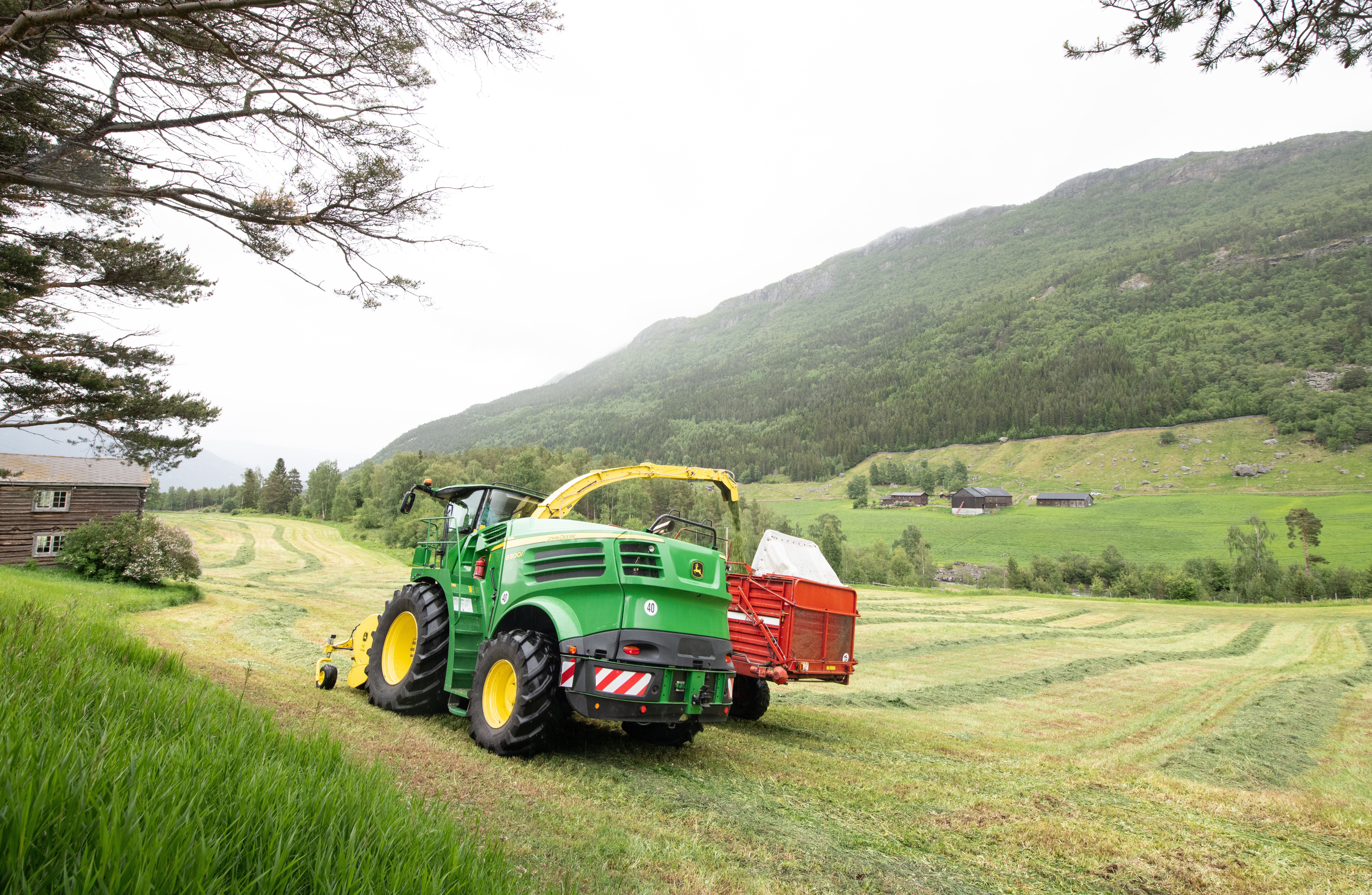 HForsomrene i Ottadalen er normalt svært tørre, men denne dagen truer mørke skyer og duskregn fra fjellene. For de som ikke rakk å slå graset på tampen av godværsperioden i mai, ble regnet i juni en utfordring. Men Hans Erik Kolden, som driver melkeproduksjon rett nord for Lom sentrum, har tatt sjansen på å slå – vel vitende om at høstekapasiteten med den nye John Deere-snitteren vil berge et bra fôr fra førstslåtten.