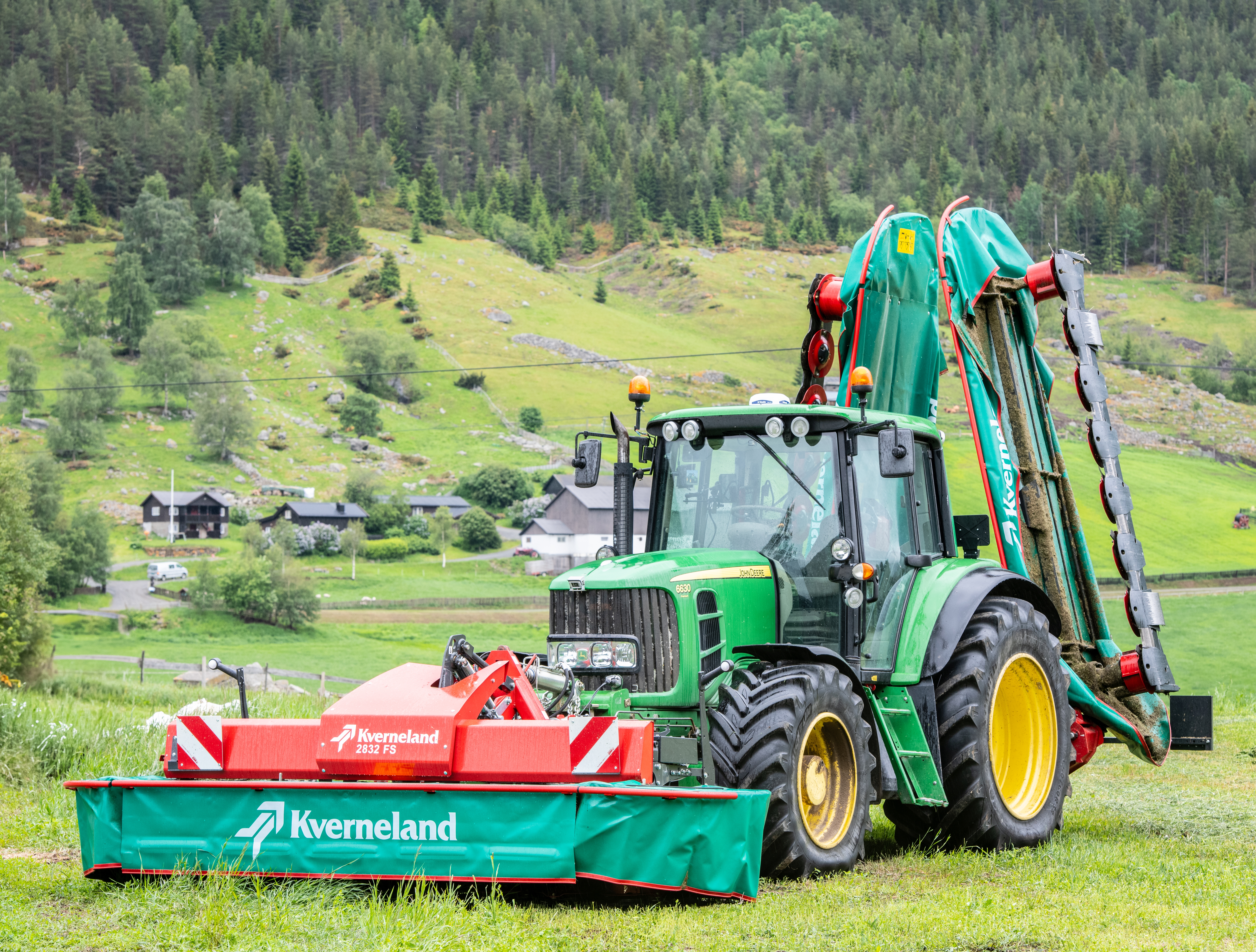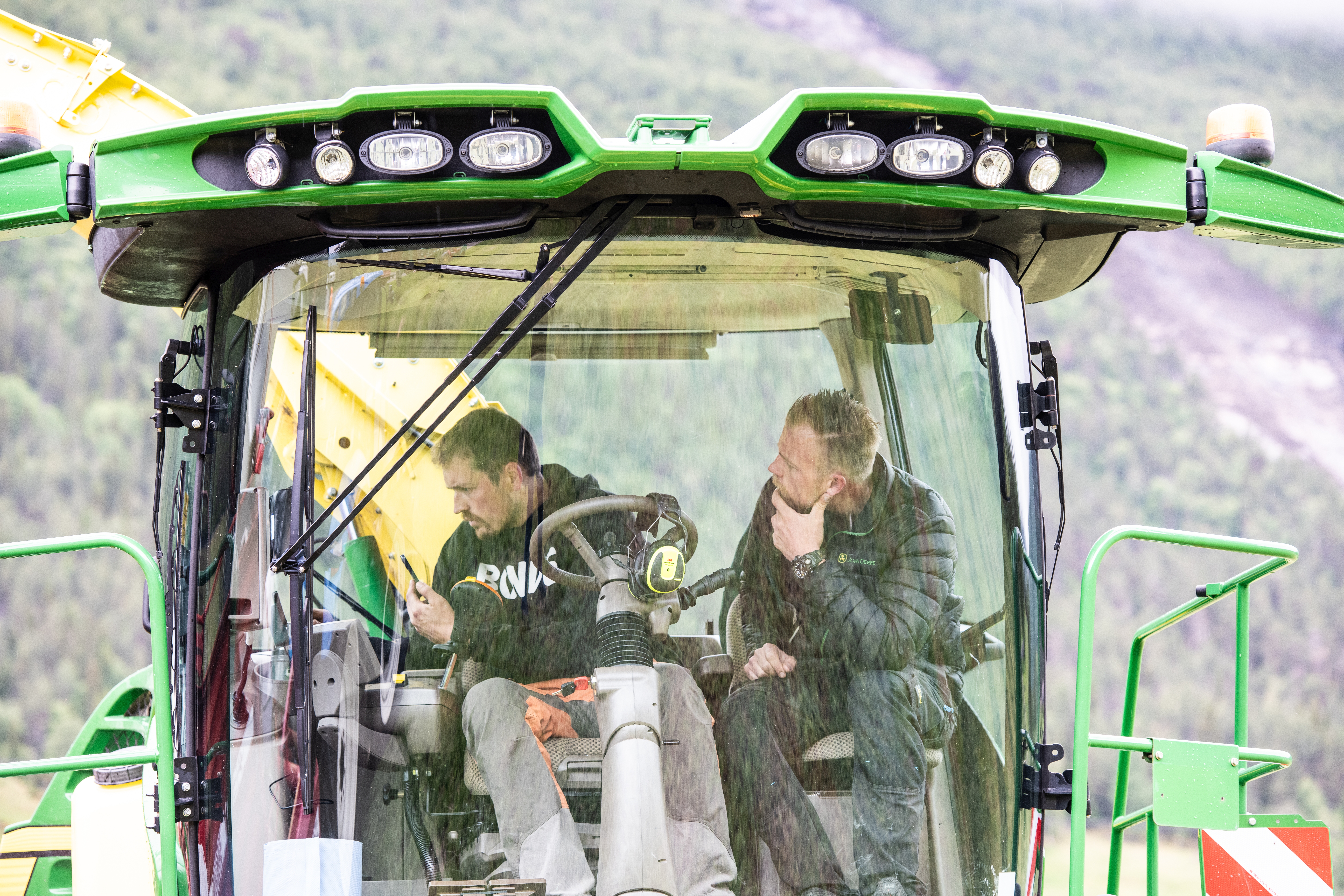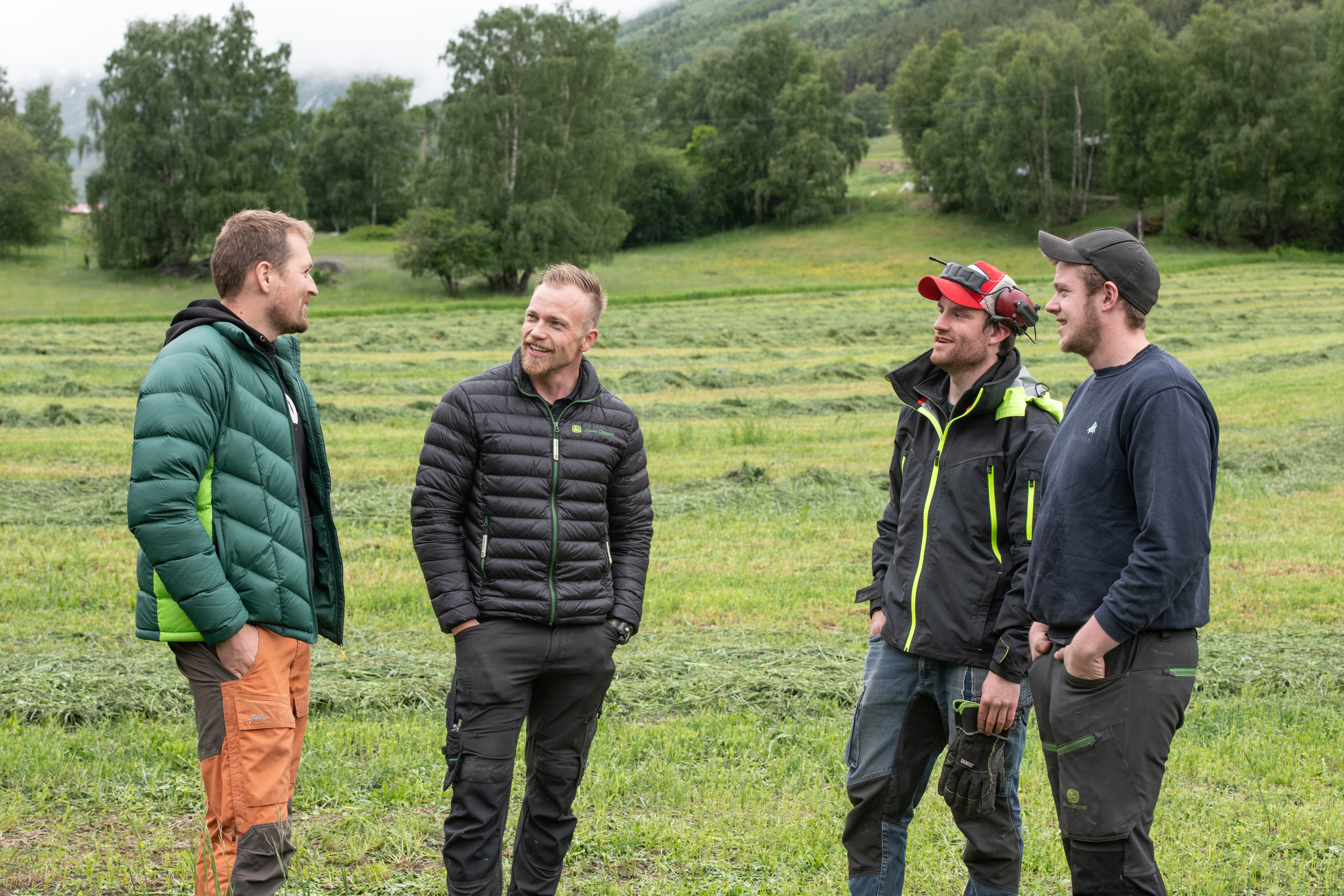 HForsomrene i Ottadalen er normalt svært tørre, men denne dagen truer mørke skyer og duskregn fra fjellene. For de som ikke rakk å slå graset på tampen av godværsperioden i mai, ble regnet i juni en utfordring. Men Hans Erik Kolden, som driver melkeproduksjon rett nord for Lom sentrum, har tatt sjansen på å slå – vel vitende om at høstekapasiteten med den nye John Deere-snitteren vil berge et bra fôr fra førstslåtten.