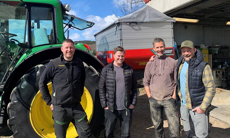 KLAR FOR JORDET: Sensorer fra SoilMate ble montert på traktor og redskap hos kunde Lars Skjennum på Maura i Nannestad. Fra venstre: Produktsjef presisjonsjordbruk Even Mangerud i Felleskjøpet Agri, presisjonsekspert Marius Elsetrønningen i Felleskjøpet, kunde Lars Skjennum og Ole J. Mørch i SoilMate.