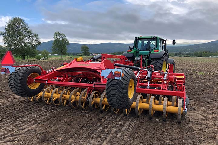 Skreddersydd: Helt forrest har maskinen en knivbjelke som river opp grastustene. Deretter følger to skålvalser og deretter to rader med tromler. Maskinen jordbearbeider ned til 18 centimeters dybde. Salgskonsulent Thomas Frankmo Tverråen merker økt interesse for utstyr til redusert jordarbeiding, selv om plogen står sterkt i Nord-Østerdalen.