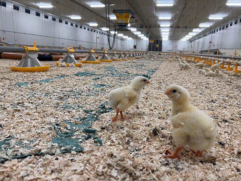 18 500 daggamle kyllinger klarer seg godt de seks timene i lastebil fra Samvirkekylling i Våler i Solør. Et rosa skjær på duna viser at de har fått Paracox-5-vaksinen som gir koksidioseimmunitet. Men plommesekken er tom, og kyllingene trenger mat og vann for å utvikle mage- og tarmfunksjon. De kommer til dekka bord. På 60 cm brede grønne papirremser har Bjørnar strødd med 2,5 mm pellets av Kromat Kylling 1 fra Skansen, og fôrskålene er fylt til de renner over. Lyden av små kyllingbein på papir stimulerer til næringsopptak, de lærer at denne lyden betyr mat, og så er den gode starten i gang.