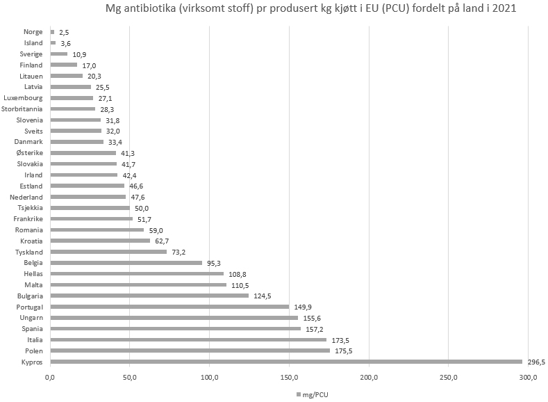 EU har en målsetning om å redusere bruken av antibiotika med 50 prosent fra 2018 til 2030, og statistikken viser at medlemsstatene pr 2021 har oppnådd en tredel av denne reduksjonen. For å sammenligne bruken av antibiotika mellom land bruker EU PCU, en populasjonskorrigerende enhet, som er lik en kg levende dyr fra et matproduserende dyr eller en fisk. I Norge ble det i 2021 brukt 2,5 mg antibiotika/PCU, mens det tilsvarende i EU var 84,4 mg/PCU. Høyest i EU var Kypros med 296,4 mg/PCU.