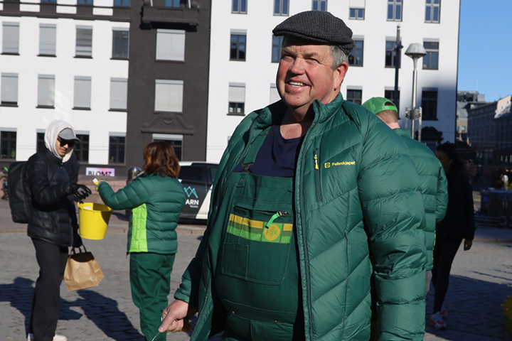 Finansminister og Senterparti-leder Trygve Slagsvold Vedum hadde også tatt på seg den grønne kjeledressen for å kaste glans over Felleskjøpets kampanje. Han tok turen fordi han er opptatt av mat og matberedskap. Her med konserndirektør Svenn Ivar fure, styreleder Anne Jødahl Skuterud, årets unge bondeduo fra 2020 og Felleskjøpet-ansatte som alle satte sjølforsyning på agendaen på Oslo S.