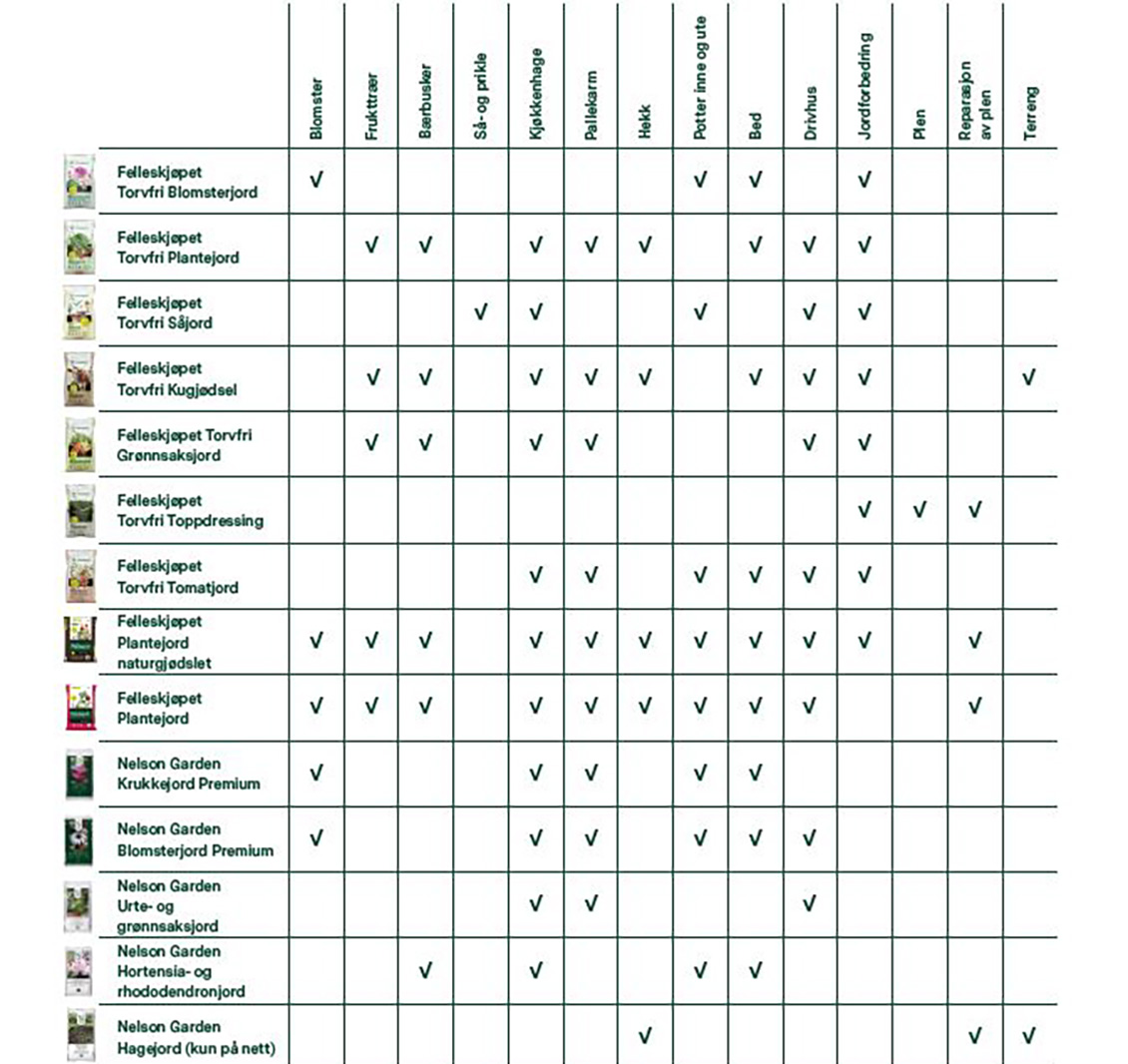 | Felleskjøpet torvfri såjord | En næringsrik torvfri jord med egenskaper som fremmer spiring. Beriket med biokull, vermikulitt og sand, som gir en fuktig og luftig jord. Nøye tilpasset mengde organisk næring, slik at planten ikke spirer for fort. Også egnet som jordforbedrer og til kaktusplanter. | |