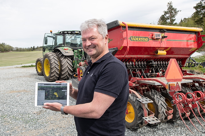 KOMBINERER: John Anders Husby kombinerer teknologien fra John Deere og Väderstad. her viser han skiftekart i Opertaions Center på Ipaden som leveres med Rapid-såmaskinen.