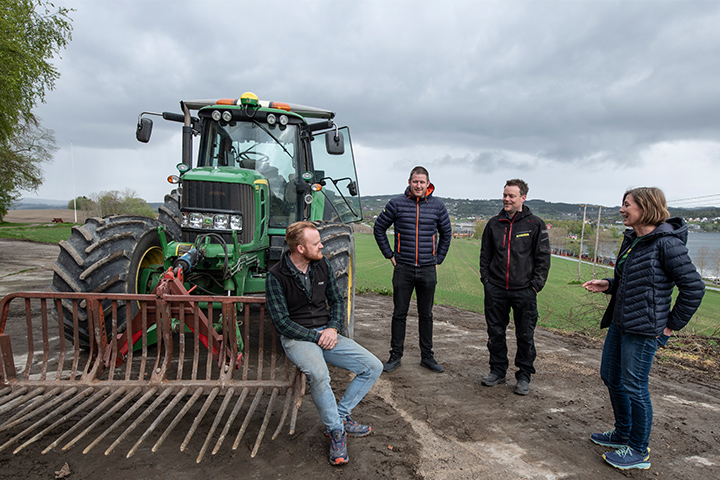 TOPPAVLING: Med Yara N-Sensor på traktortaket oppdaget Hammer et stort avlingspotensial i fjorårets byggåker. – Nye sorter har stort potensial, men trenger godt stell, konstaterer rådgiver Eva Pauline Hedegart på besøk hos Hammer sammen med Felleskjøpet-kollegaene Even Kristian Mangerud og Marius Østerås. På jordet nedenfor traktoren har Hammer sådd havre etter fordige fangvekster i fjor høst.