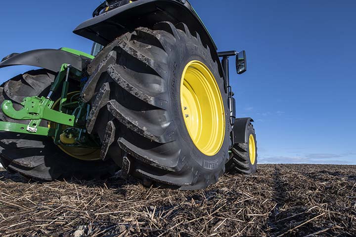 Fleksibel hjuldiameter: John Deere 6R gir deg mulighet til på en enkel måte å endre utvekslingsforholdet mellom framhjulene og bakhjulene. Dette gjøres ved å skifte ut tannhjul i transmisjonen, slik at forspinnet forblir korrekt hvis du endrer hjuldiameteren foran eller bak. I praksis betyr det større valgfrihet når det gjelder valg av dekk, både når det gjelder dimensjon og merke, og alltid korrekt forspinn.
