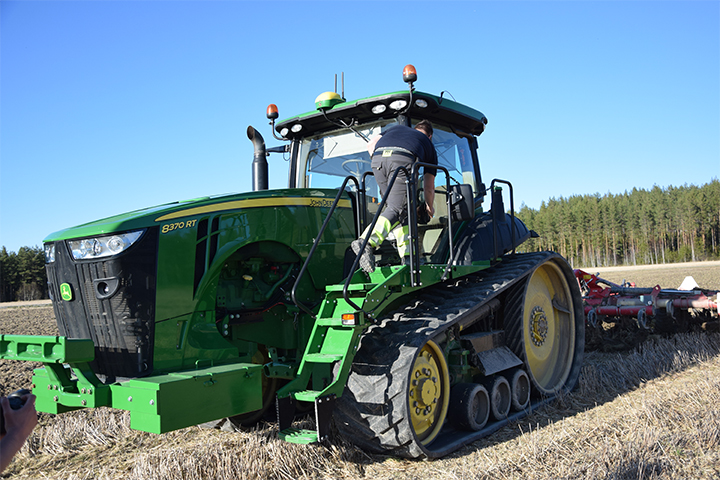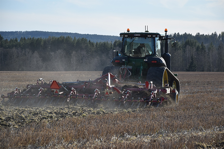 Hans Stumberg begynte med pløyefri dyrking allerede for tjue år siden. Han er langt over middels opptatt av jordstruktur, meitemark og organisk materiale i jorda, og harving er en viktig del av driftsopplegget. Bakpå belteraktoren har Stumberg kobla på en harv av typen Vaderstad Swift med 5,60 meters arbeidsbredde. Traktoren har autostyring, AutoPower og er kobla opp til JD-link.