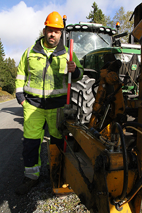 Den ene entreprenør-traktoren hans, en John Deere 6250 R, var to år gammel 1. september i år. Da hadde den gått over 3 500 timer i brøyting, strøing og annet veivedlikehold. Det omfatter blant 60 000 start og stopp i forbindelse med planting av oransje brøytestikker langs 200 mil riks- og fylkesveier for Veidekke i Trøndelag.