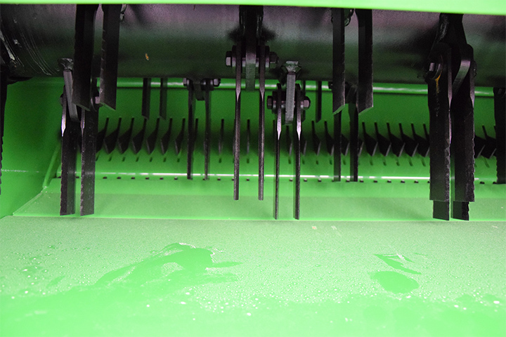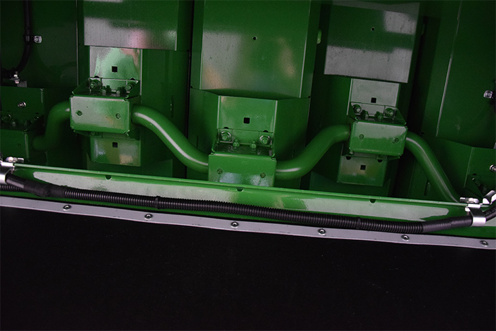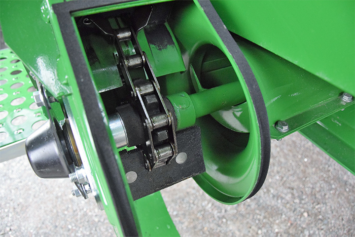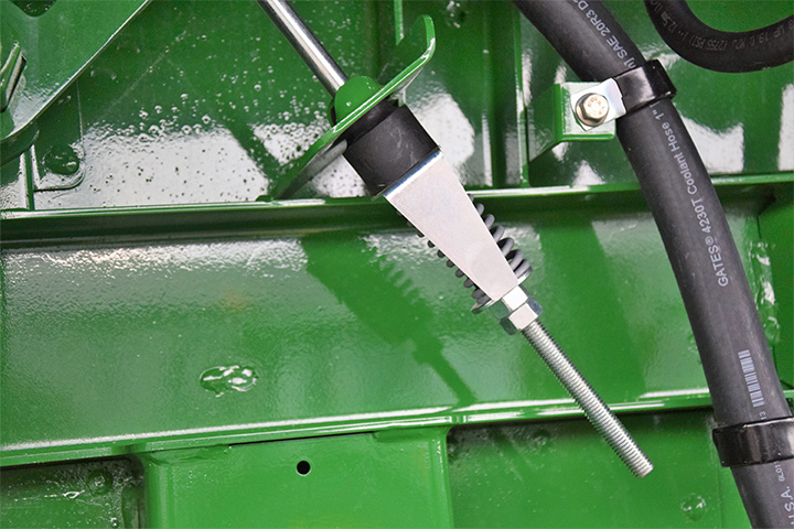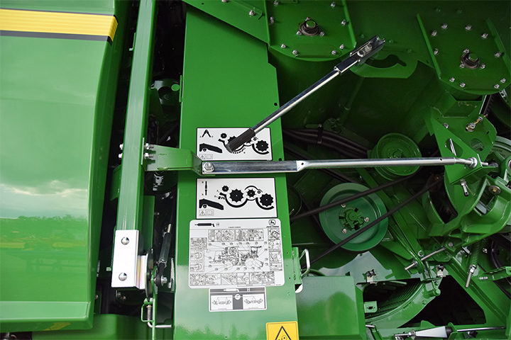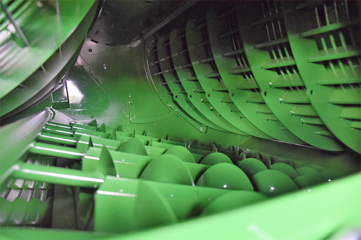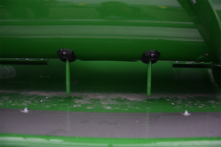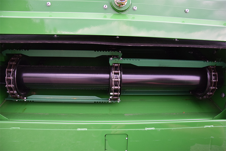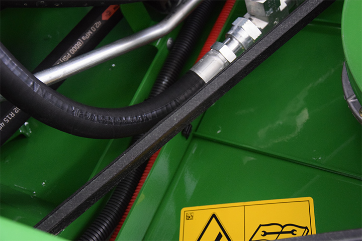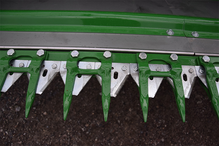 a) Innmatinga er et av de viktigste punktene i treskinga. Det er helt sentralt at kniver og fingre er i tipp topp stand. Sjekk knivdrivning. Knivene skal gå lett i hele slaglengden. Er det slitasje, bør både kniver og fingre byttes. Sjekk linjering av fingrene, slik at ingen av dem er bøyd opp eller ned på grunn av feste av legdeløftere.