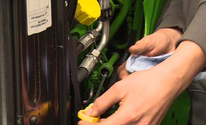 Før bruk av traktoren i vintermånedene er det veldig lurt å peile motoroljen. Sjekk at du både har riktig nivå, riktig farge og riktig konsistens på oljen slik at den tåler en hard arbeidsdag. Pass på at du har olje, AdBlue og andre smøremidler du trenger.