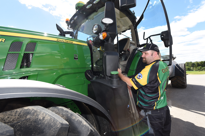 HEIS: Den eneste modifikasjonen av John Deeres modell 6250R som John Peder Gjerlaug trengte, var en spesialkonstruert heisanordning så han kommer seg ut og inn av førerhuset.