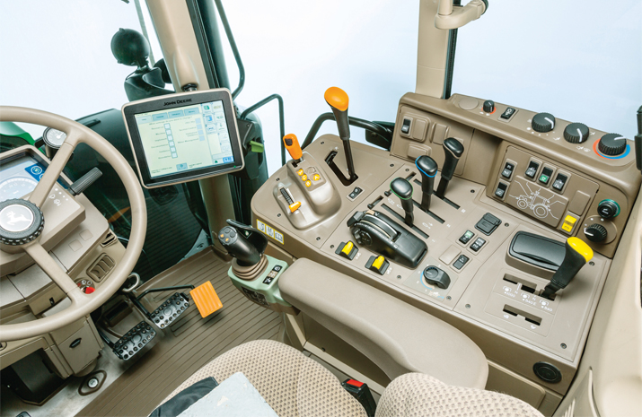 OVERSIKTLIG: John Deere 6M byr på et enkelt og oversiktlig førermiljø. CommandQuad girkassen kan betjenes både fra den elektriske lasterspaken og fra den oransje hendelen med rullehjul. Foto: John Deere