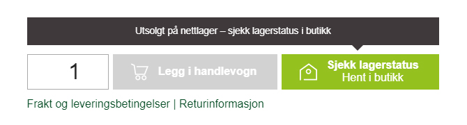 Dersom produktet er utsolgt i nettbutikken, kan du sjekke lagerstatus i din nærmeste butikk. Dersom varen er på lager i din butikk kan du legge den i handlekurven og betale på nett. Du får beskjed når varen er klar for henting i din butikk.