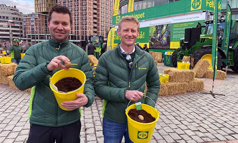 Fredag morgen tok han imot landbruks- og matminister Geir Pollestad på en av landets travleste plasser, rett utenfor Oslo sentralstasjon. Sammen med representanter fra Felleskjøpet var Pollestad med og delte ut gule Felleskjøpet-bøtter, alle med én settepotet satt i jord, til forbipasserende utenfor Oslo S.