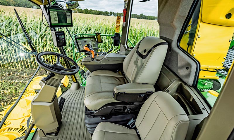 ActiveSeat i F8- og F9-seriene kan dreies 16 grader til høyre og til venstre for enkel tilgang og fremragende synlighet. Ekstrautstyret ActiveSeat II har også fullt justerbare elektriske kontroller, kjøling/oppvarming, en massasjefunksjon og aktiv fjæringsteknologi som isolerer opptil 90 prosent av vertikale bevegelser for en jevn opplevelse. De slanke stolpene i førerhuset og de buede vinduene gir panoramautsikt til toppen av utkastertuten og den justerbare klaffen. Utløpet kan nå roteres opptil 230 grader for optimal lossing, mens det nyutviklede styresystemet på bakakselen gir en imponerende svingradius på 6 meter for raskere vendinger på vendeteigen.