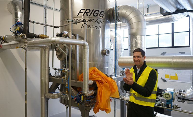 Tirsdag avduket klima- og miljøvernminister Andreas Bjelland Eriksen den industrielle varmepumpen «Frigg», som er installert i Felleskjøpets fórfabrikk på Skansen i Trondheim.