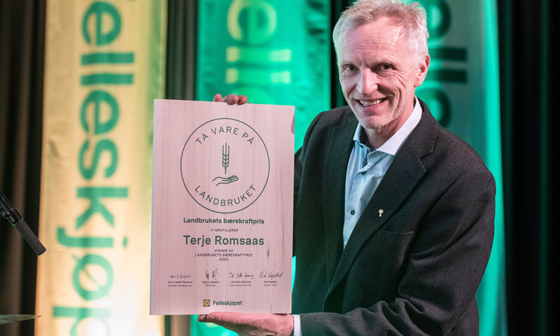 Terje Romsaas fra Sørum fikk Landbrukets bærekraftpris i 2023. Da ble prisen utdelt på årsmøtet i Felleskjøpet Agri. I år er planen å ha utdelingen under Agroteknikk 2024. (Foto: Håvard Simonsen/Felleskjøpet)