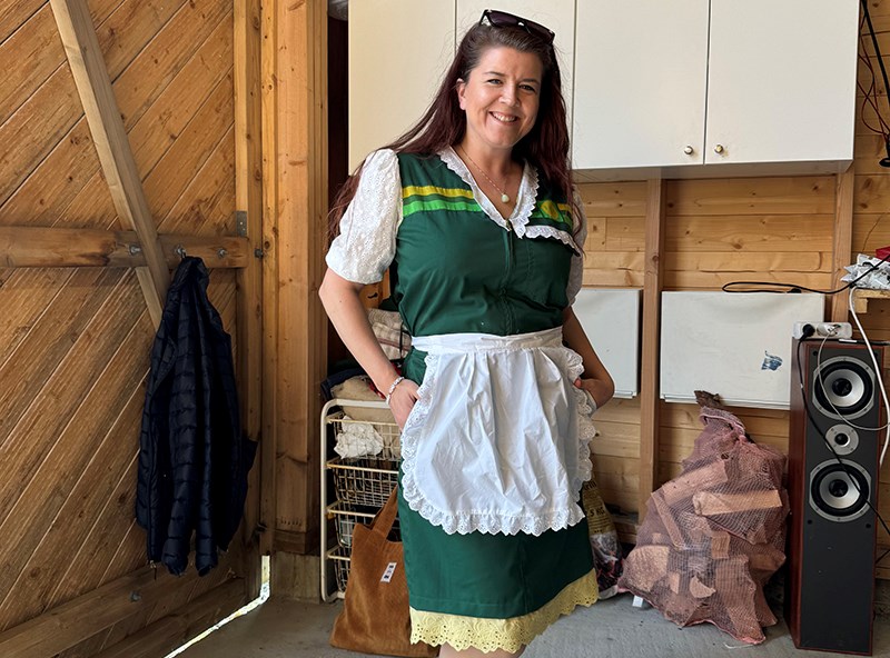 I fjor skulle Wenche Bergslid fra Elnesvågen på firmafest med bondetema. Den kreative kjøkkenselgeren skaffet seg en Felleskjøpet-dress.